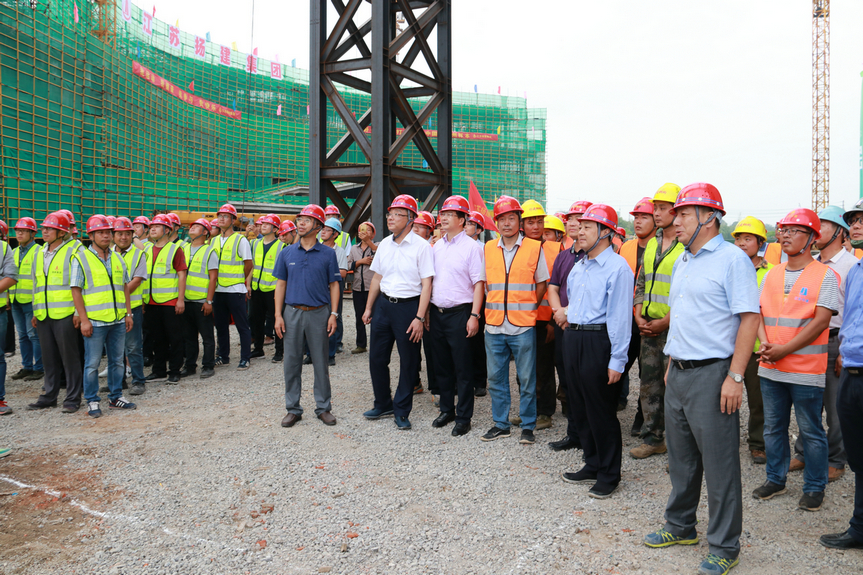 揚建網訊 激情省運會,魅力新揚州。9月18日下午,在省運會即將盛大開幕之際,市委書記謝正義率市委常委、秘書長陳鍇竑、副市長余珽一行專程視察我集團承建的新大劇院項目并慰問施工人員。集團總經理鄒厚存、副總經理劉海斌等陪同。