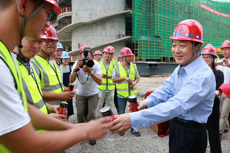 謝書記一行首先沿著劇院外立面仔細察看了已經高高矗立的南、北立面幕墻和噴繪效果,對揚建集團克服困難提前完成“9·20”建設目標表示肯定,并認真聽取和詢問了后續施工情況。在南立面連廊部位,謝書記為一塊正在安裝的幕墻板塊系上紅綢并目送安裝到位。隨后,謝書記慰問了現場施工人員,祝賀新大劇院建設取得階段性成果,感謝大家的辛苦付出。
