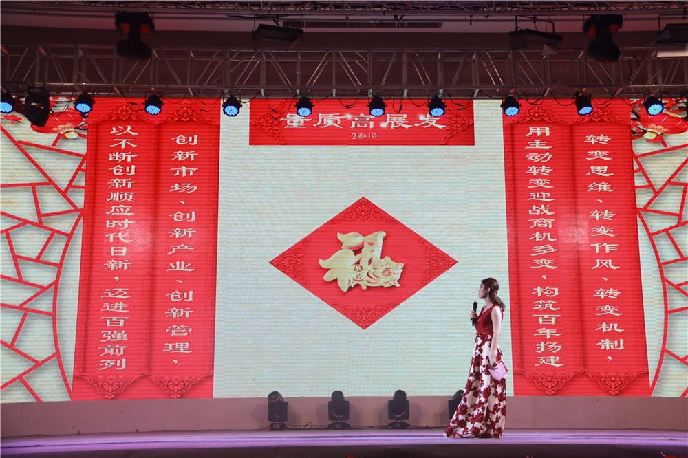 在總部員工表演的開場舞《錦繡前程》節(jié)目之后,按照慣例繼續(xù)送出2019年的團(tuán)拜春聯(lián)。上聯(lián):轉(zhuǎn)變思維、轉(zhuǎn)變作風(fēng)、轉(zhuǎn)變機制,用主動轉(zhuǎn)變迎戰(zhàn)商機多變,構(gòu)筑百年揚建;下聯(lián):創(chuàng)新市場、創(chuàng)新產(chǎn)業(yè)、創(chuàng)新管理,以不斷創(chuàng)新順應(yīng)時代日新,邁進(jìn)百強前列;橫批:發(fā)展高質(zhì)量。