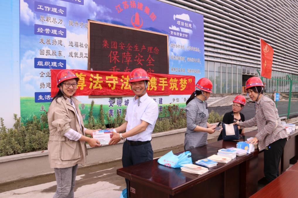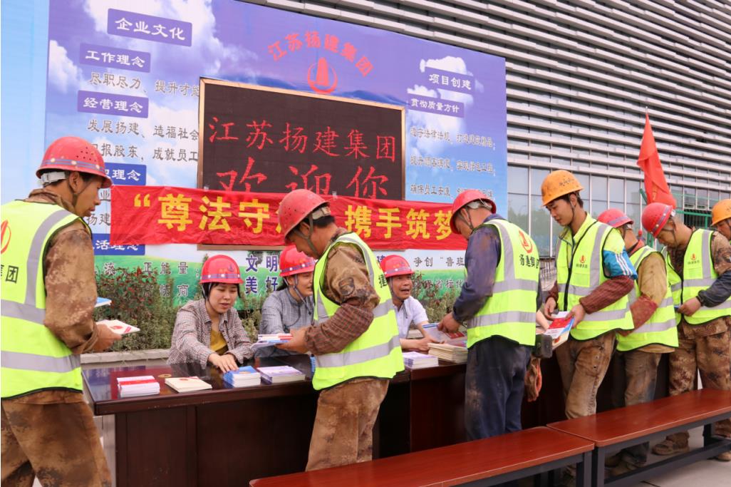 揚(yáng)建網(wǎng)訊 為了讓農(nóng)民工能尊法守法,且能用法律武器維護(hù)自己的合法權(quán)益,市總工會(huì)開(kāi)展了送法下工地活動(dòng) 。28日下午,市總工會(huì)法工部郭永忠部長(zhǎng)帶領(lǐng)揚(yáng)州市總工會(huì)律師顧問(wèn)一行4人,深入到我集團(tuán)承建的揚(yáng)州市大劇院項(xiàng)目部施工現(xiàn)場(chǎng),開(kāi)展“尊法守法·攜手筑夢(mèng)”宣傳活動(dòng)。
