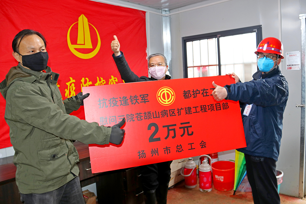 揚建微訊 2月15日下午,揚州市建設(shè)工會范華主任受市總工會黨組書記李春國的委托,看望慰問我集團(tuán)揚州三院蒼頡山病區(qū)擴(kuò)建工程項目部骨干員工。我集團(tuán)黨委副書記、工會主席張振新,集團(tuán)副總經(jīng)理、擴(kuò)建工程項目部臨時工會主席郝敬東陪同。范華主任向我集團(tuán)奮戰(zhàn)在“抗疫”施工一線的骨干員工表示慰問,并向擴(kuò)建工程項目部臨時工會委員會送來了2萬元疫情防控專項慰問金。