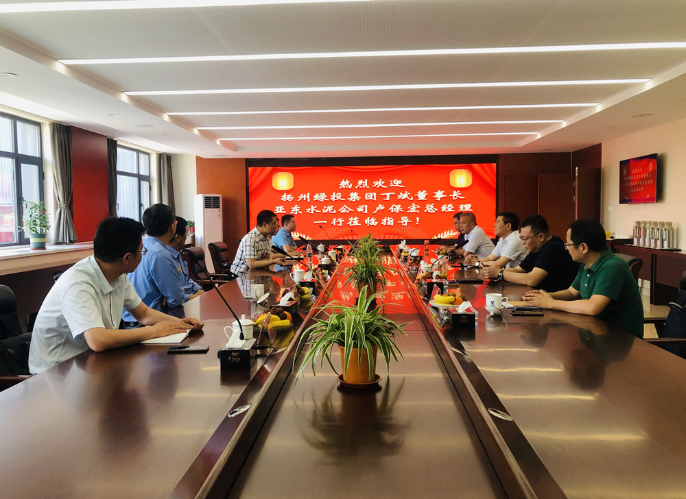 揚建網訊 6月8日下午,揚州綠投集團丁斌董事長、亞東水泥公司盧保宏總經理一行來到建祥系列華運公司洽談合作事宜。我集團執行總裁、建祥系列公司董事長沈國仁及賈向鋒、朱兆善、高校、王茂才等同志陪同參觀并會談。