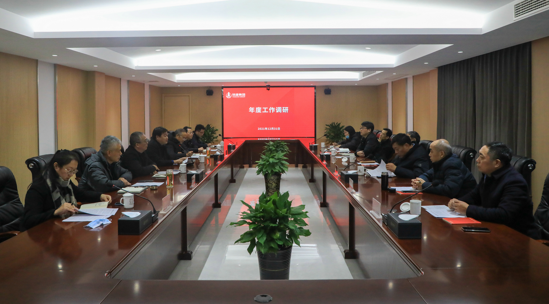 揚建網訊 2021年12月31日下午,市建工控股公司董事長王宏一行7人蒞臨我集團調研年度工作;我集團公司董事長康往東等領導參加了調研會。