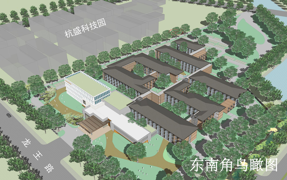 該項目位于328國道與金灣路交叉口西南角,地勢平坦;北側現有排澇河流,西側與杭盛工業園相鄰。項目占地約51畝,后期預備留用地約21畝,本期建設規模約3萬平方米,共建有500間客房和相關配套設施,防疫按照三區三通道的要求予以設計,主體建筑采用箱式結構局部鋼結構建造。該項目采用院落式布局,以3-4層的建筑通過連廊圍合形成形態各異的庭院空間,實現人與建筑、自然和諧共生,未來將作為杭集工業園區的配套公寓。