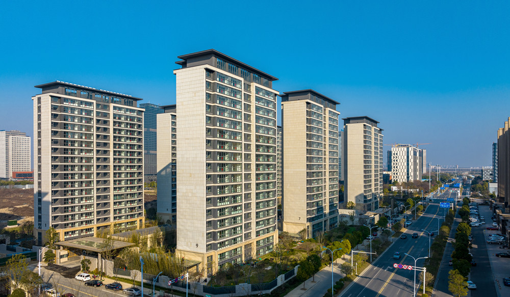 該項目秉承“景觀滲透、和諧人居、智慧住宅”的理念,以圍合式布局小區,實行人車分流,打造一環一心兩軸四苑,環形健身步道環繞整個社區;底層架空,通過中心文化活動軸線串聯四大花苑空間。該項目總建筑面積9.6265萬㎡,總投資12.85億元,由8棟18層住宅、2棟1層配電房、水泵房、1棟2層物業用房及地庫(地下1層)組成。4種樓型,5種歸類戶型,適老性戶型占比達到49%。小區綠地率35.3%,場地年徑流總量控制率55%,太陽能熱水供熱比例36%,567m3雨水回用系統。