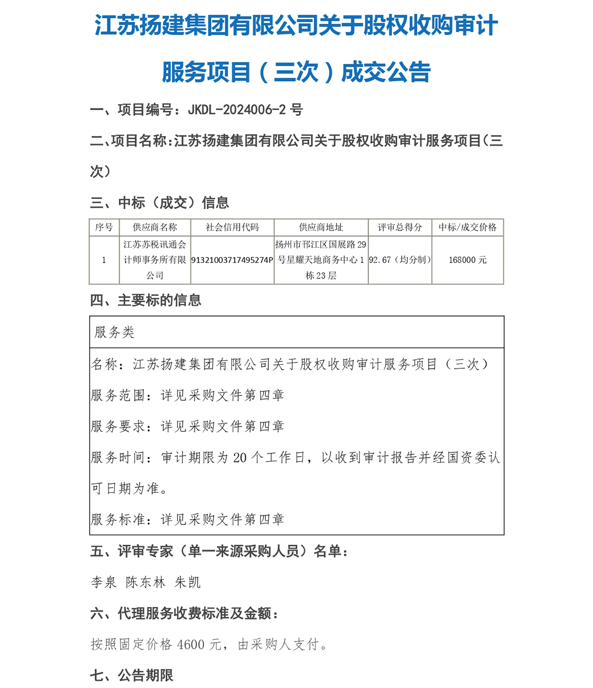 江蘇揚建集團有限公司關于股權收購審計服務項目(三次)成交公告